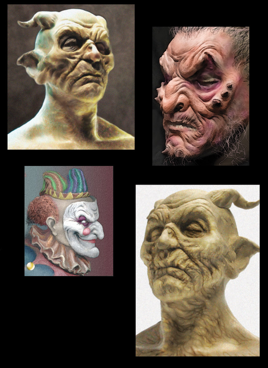 Paintings over photos of rough or unpainted sculptures to show finished state or color ideas: