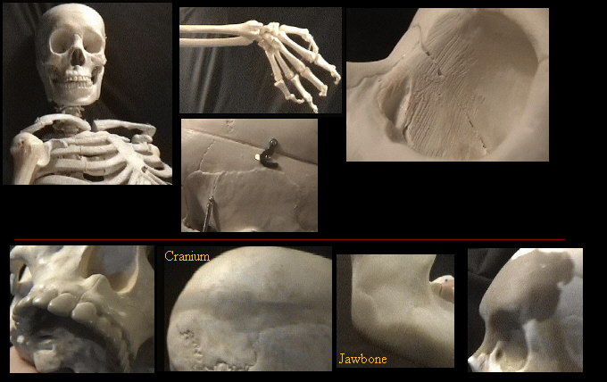 I started with a skeleton from the Anatomical Chart Company. It was one of the cheaper ones, so there were many imperfections I had to repair. The jaw was far too wide, so I heated it, and bent it to conform to the rest of the skull. I also had to do quite a bit of grinding and sanding to get it into shape. The same for the eye sockets. I removed all the metal hinges. The I blended epoxy putty to cover those areas and secure the top of the cranium. I reshaped some of the chin with epoxy and completely reshaped the teeth to make them look a bit more realistic. Finally; since the forehead and brow region didn't look quite right, I created a new one from epoxy. |