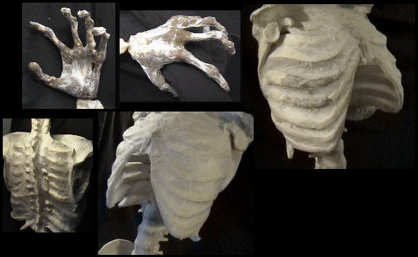 I wanted it to remain free to flex later on. I did the same process on the torso, covering all the hollow areas between the ribs, and giving me a surface to work on later. This also obscured any metal bolts and screws I couldn't feasibly remove. At this point the body began to resemble a mummy. |